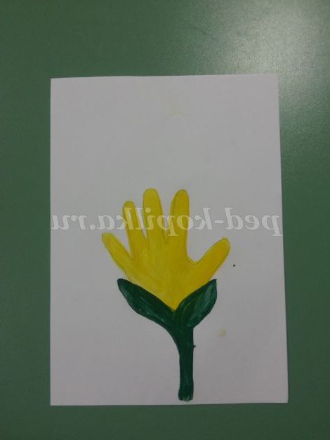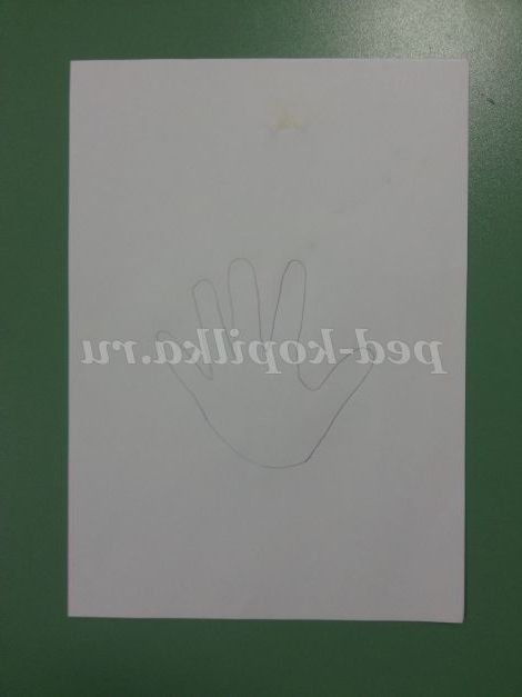 Для початку потрібно зробити трафарет для нашого квітки. Дитина прикладає свою долоньку до чистого аркушу паперу і обводить