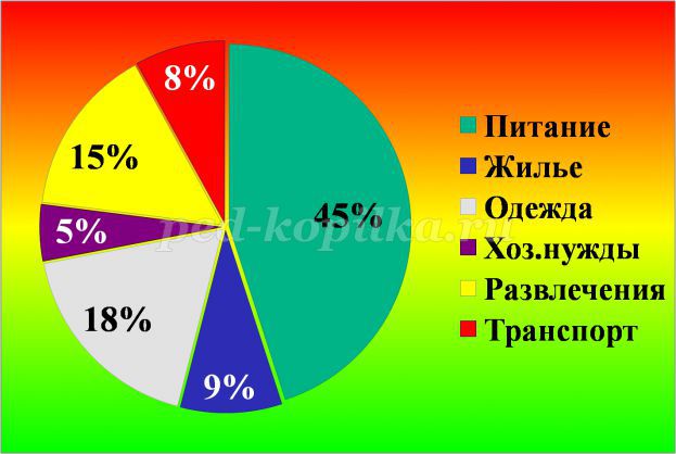 Розглянемо малюнок 12 . У вигляді якоїсь фігури представлені види витрат на даної діаграмі? (Коло). Як може називатися така діаграма? (Кругова). У чому відмінність кругової діаграми від всіх інших? (Коло поділений на частки (частини). Кожна частина - це певний вид витрат)