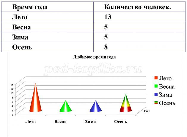 Ви проводили опитування серед учнів 4-9 класів по темі «Улюблена пора року» та надали мені таблицю. Я ж склала діаграму по цій таблиці.