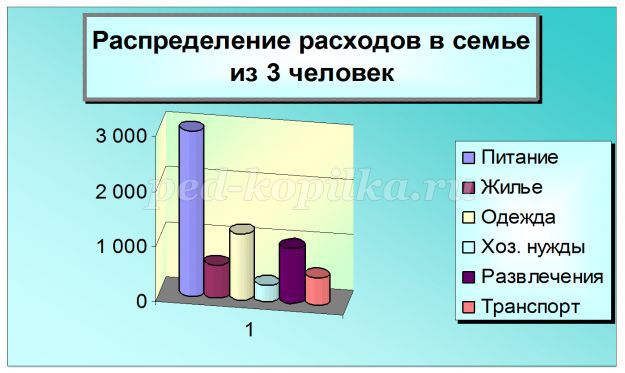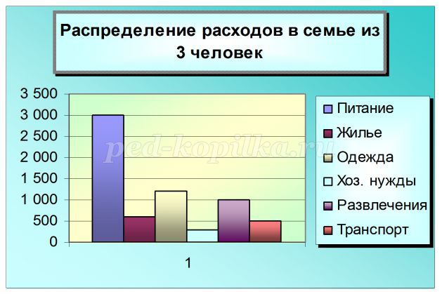 Розглянемо малюнок 8. На ньому інформація про розподіл видатків на людину в місяць дана у вигляді діаграми . Як ви думаєте, яка інформація на цій діаграмі розташована горизонтально? (Вид витрат) А вертикально? (Сума витрат) У вигляді якихось фігур представлені види витрат на діаграмі? (Стовпчики) Як може називатися така діаграма? (Стовпчикова)