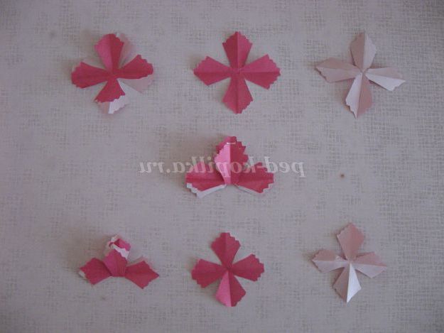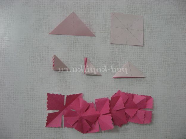 Вирізаємо пелюстки квітів. Складаємо квадрати в п'ятеро (подобою вирізання новорічних сніжинок), так щоб вийшов трикутник. Вирізаємо зубчики з боку й підрізаємо лінію згину з одного боку на 1-2 мм, можна глибше, якщо хочете «стрункі» пелюстки.