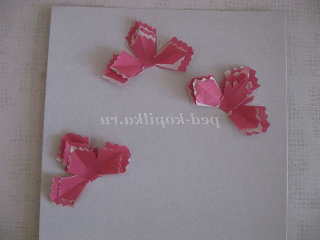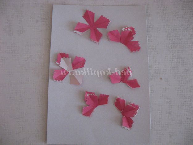 Складання квітів. Один квітка кладемо виворотом вгору на нього - виворотом вниз і загортаємо нижній пелюстка, таким чином, складаємо всі квіти.