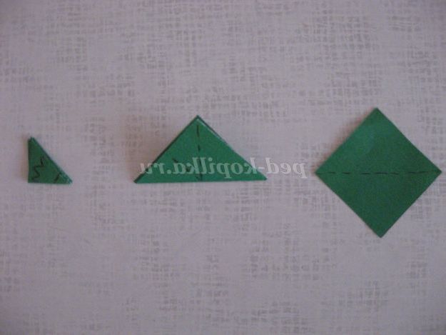 Виготовляємо зелену частину квітки. Складаємо квадрати в п'ятеро, отримуємо трикутник і вирізаємо зубчики, зрізаємо кут. Повинен вийде, маленький кульок, з відрізаним кутом.