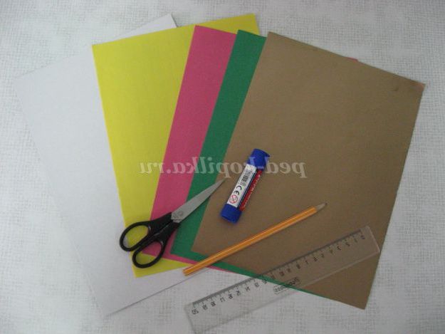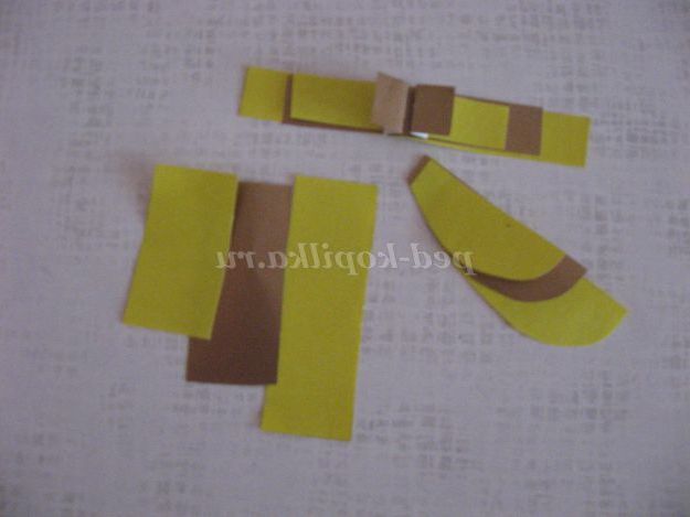Виготовляємо бант. Склеюємо в середині смужки, чергуючи кольору. У більш широких смужок попередньо зріжемо кути.