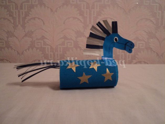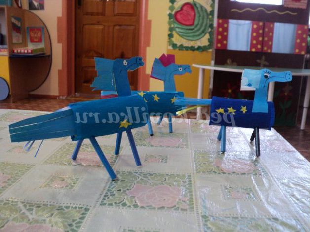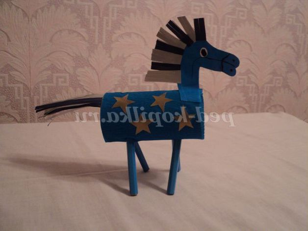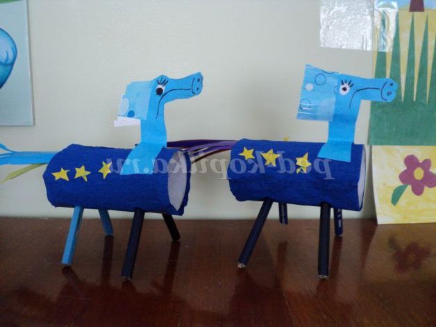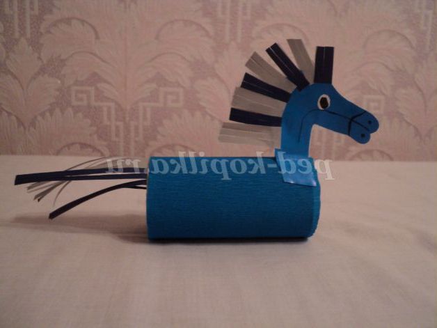 За шаблоном діти обводять голову коня на складеної навпіл синьою папері, вирізають, згинають кінці і приклеюють до тулуба.