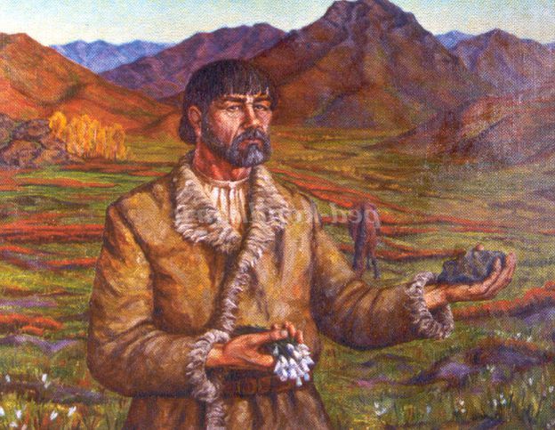 Виходить мужик з торбинкою, ходить, щось шукає, щось постукує, перебирає камені. Сідає на пеньок, розгортає старовинну папір: Мужик: Далеко ж я забрався, так, перевіримо: від верхньої пристані на Іртиші вгору до лівого припливу Бухтармы в 60 верстах. Ось місце впадання річки Маслянки в Березівку, а от древні розробки. Чудские копальні. Так, не підвела древня карта, не підвела. Так в Москву і відпишу. Тут треба добувати у підніжжя «Золотий гірки» - підбирає камені і йде.