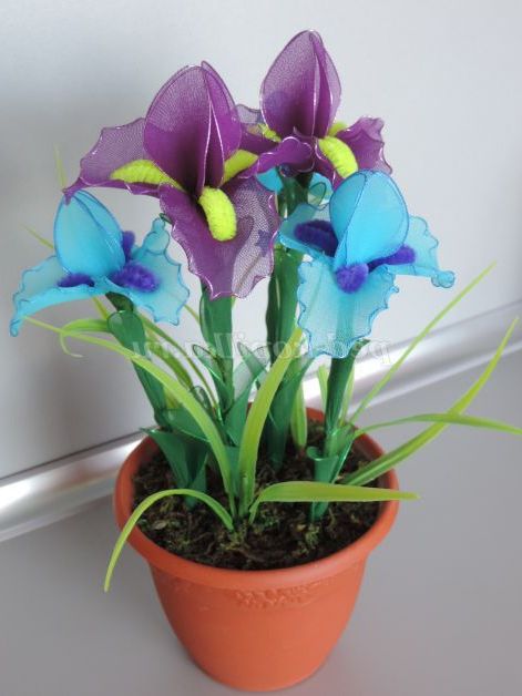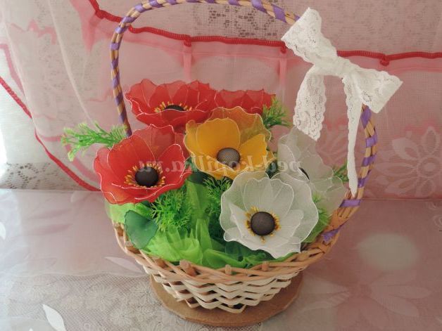 квіти з капрону своїми руками, квіти в корзині своїми руками, маки своїми руками, вироби з капронових колгот