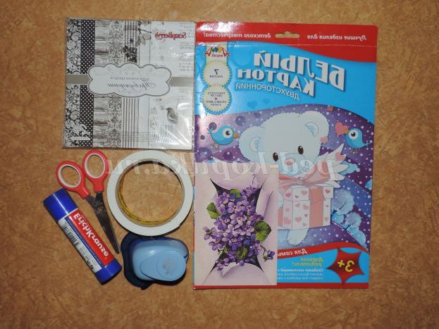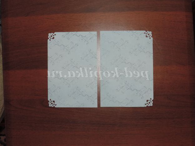 5. З паперу для скрапбука вирізаємо прямокутники на 0,5 см менше основи. За допомогою діркопробивача кута оформляємо краю і приклеюємо всередину основи.