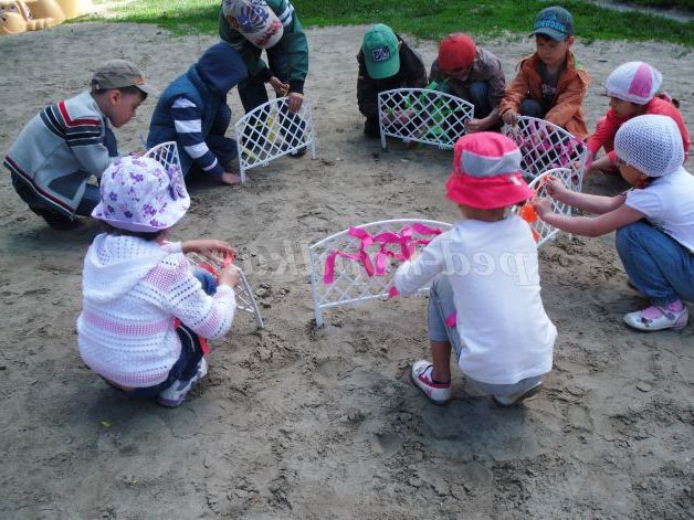 Перед дітьми ставляться парканчики і даються стрічки різних кольорів. Залежно від завдання, дається завдання. Наприклад, для молодших дошкільнят, зав'язати стрічки зеленого кольору. Так як парканчиків може бути кілька, можна дати завдання на швидкість і правильність зав'язування вузликів. Для старших дошкільнят дається завдання: З кожним зав'язаним бантиком називати предмети, які знадобляться в поході.