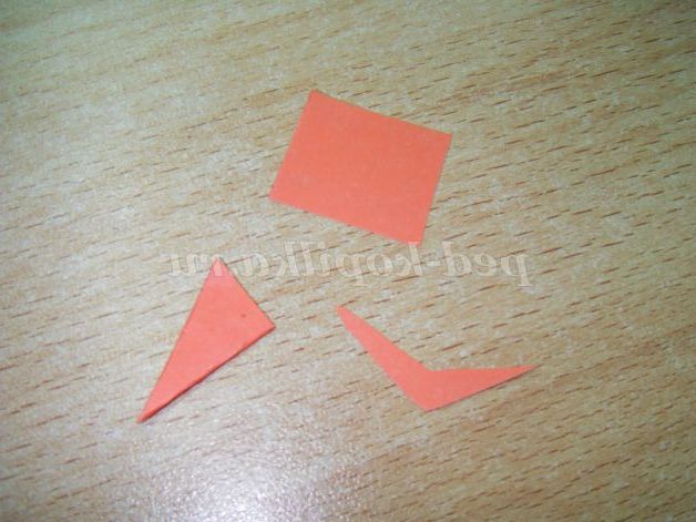 Тепер нам залишилося зробити рот і ніс-морквину. Для цього беремо червоний папір і вирізаємо рот. Щоб зробити ніс, беремо квадрат червоного кольору. Складаємо його у вигляді морквини, загинаємо кінчик для приклеювання. Обрізаємо зайве.