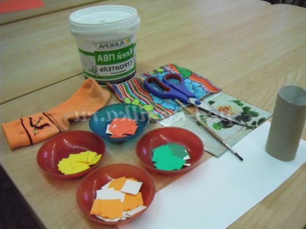 Для рук беремо білі смужки і кольорові квадратики, з яких вирізаємо рукавиці.