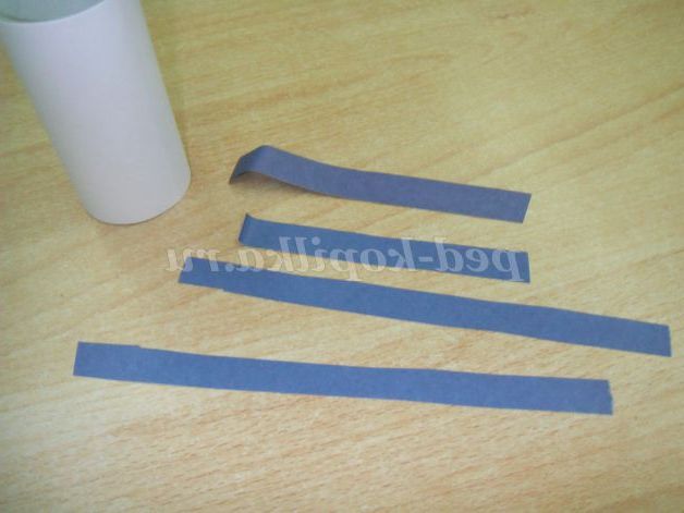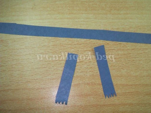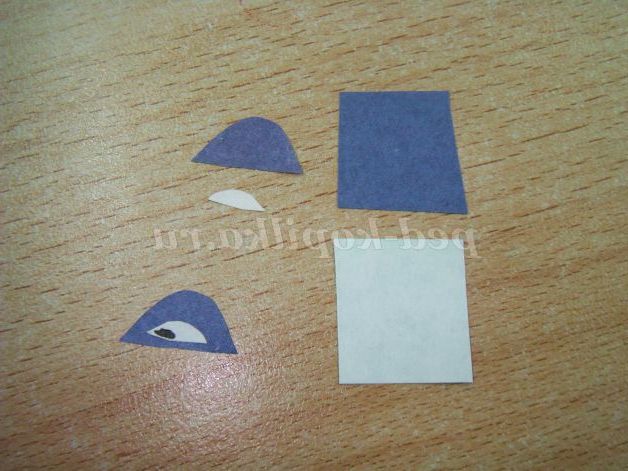 Робимо очі. Беремо синю кольоровий папір і вирізаємо півколо, потім білу папір і вирізаємо півколо меншого розміру. На білому півколі малюємо зіницю.