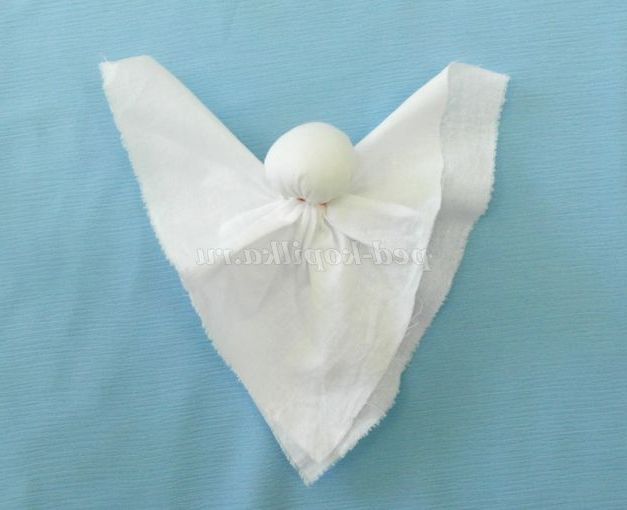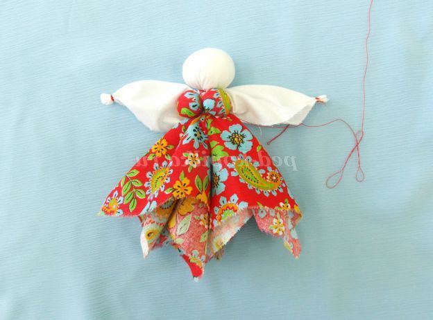 Крок 1. Виготовлення голови ляльки. В середину білого лосута вкладаємо шматочок синтепону, формуємо голівку і сматываем ниткою, робимо закріпивши. Заготівлі надаємо форму тулуба, склавши її по діагоналі. Кути, що знаходяться по сторонах заготовки - це ручки, кути, поєднуються знизу - тулуб.
