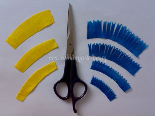 Беремо ножиці і починаємо надрізати кожну смужку з одного боку, не дорізуючи до краю 0,5 див. Чим ширше смужка, тим крупніше нарізається "соломка" і пуп'янок буде виразний, а можна надрізати всі смужки однаково вузько - бутон вийде пишний. Для волошки - на кінці кожної надрізаної смужки робимо виріз у формі прапорця - робота копітка, але вона цього варта.