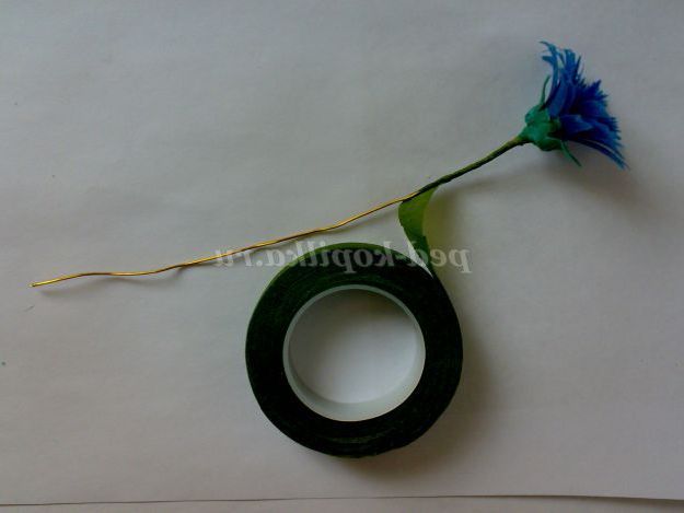 Приклеїмо підготовлений чашолисток до бутону волошки. Стебло у квітки тонкий, тому буде достатньо задекорувати його флористичної стрічкою. шматок стрічки разрежем навпіл і акуратно обмотаємо дріт, на якій закріплений бутон волошки. Можна не економити і працювати з стрічкою, не розрізаючи її.