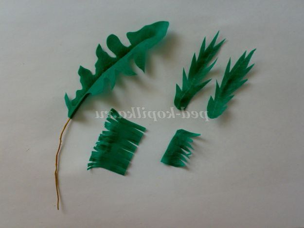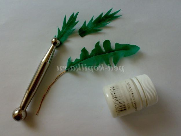 При розгляданні картинок бачимо, що листя не плоскі, вони мають різні зігнутості. Беремо бульку з кульками на кінцях, або працюємо толстным кінцем стандартної бульки - кладемо кожен лист на середину долоні і продавлюємо (прокатуємо) булькой по центру аркуша. Лист для кульбаби великий і форму без каркасу тримати не буде - необхідно вставити в середину тонкий дріт (наносимо клей на дріт, кладемо на середину аркуша, складаємо навпіл, потім розкриваємо назад, але не до кінця - "ховаємо" дріт всередині).