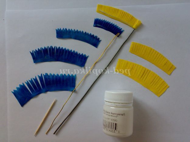 Для того, щоб закінчити бутон, беремо дріт: для кульбаби товсту, для волошки - тонку. На кінці кожної робимо маленьку петельку, щоб бутон краще закріпився на дроті. Наносимо латексний клей за допомогою зубочистки на сторону, яку ми не різали і починаємо туго закручувати смужку за смужкою на дріт.