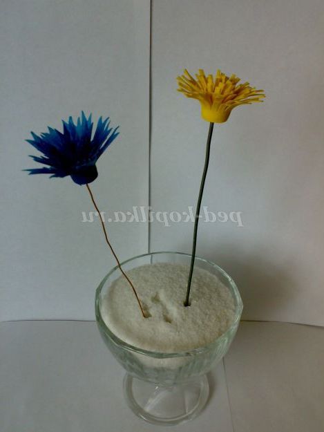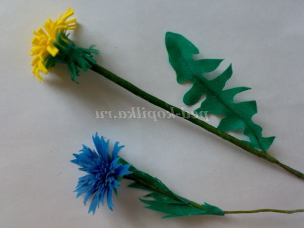 Тепер потрібно закінчити "Збирати" квіти. До бутону кульбаби приклеюємо чашолисток, закріплюємо флористичної стрічкою лист. До стебла волошки приклеюємо листя.