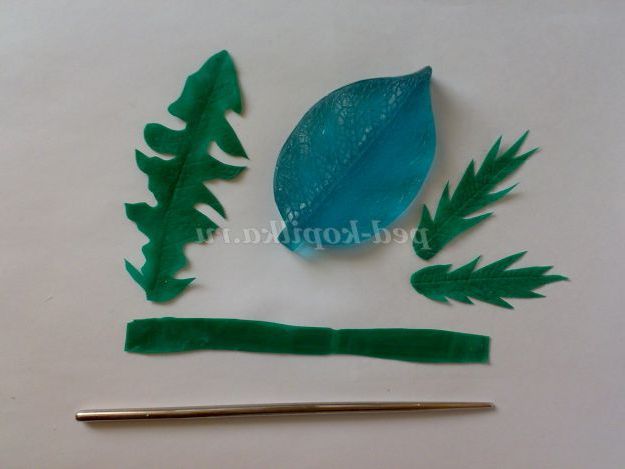 Дістаємо глину зеленого кольору. З допомогою стандартної бульки розкачуємо глину і вирізаємо смужки: одну довгу - для стебла кульбаби, дві короткі - для листя волошки, одну широку - для листків кульбаби. Тепер потрібно розглянути на картинках, яку форму мають листки виготовляються квітів і вирізати за зразком. Надаємо листю фактуру - накладаємо на молд у формі листа (співвідносимо середину листа з серединою прес-форми), продавлюємо глину, отримуючи відбиток, лист перевертаємо і знову продавлюємо, отримуємо відбиток з іншого боку.