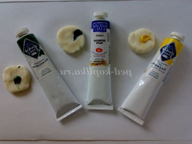 Відщипуємо від шматка (стандартний 200 гр.) приблизно 20 гр. - цього достатньо для виготовлення 1,2 квітів. Видавлюємо з тюбика горошину фарби на "коржик" з глини і розминаємо до рівномірного розподілу кольору (після висихання глина стає яскравішим). Пофарбований шматок відразу прибираємо в мішок і приступаємо до роботи з наступним. У підсумку, одержуємо три шматка глини жовтого, синього і зеленого кольору.