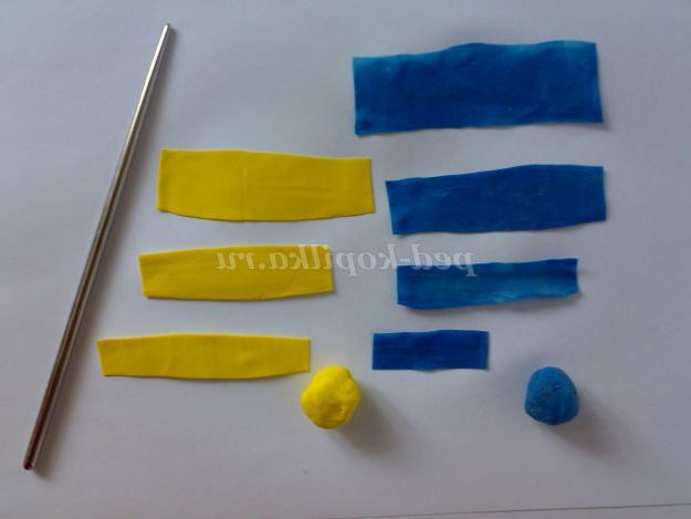 Відщипуємо шматок жовтої глини завбільшки з горошину (решту прибираємо в мішок). Швидко формуємо пальцями глиняну паличку і починаємо, з допомогою стандартної бульки, розкачувати тонку довгу смужку (1см на 3 см) на долоньці. Якщо на долоньці не виходить, можна викачувати на столі (часто перевертаючи), але тонко, не вийде. Як тільки глина рівномірно розхитано, вирізаємо з паперу ножицями прямокутну смужку. Теж саме робимо з синьою глиною.