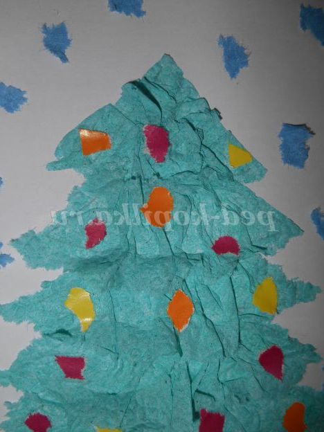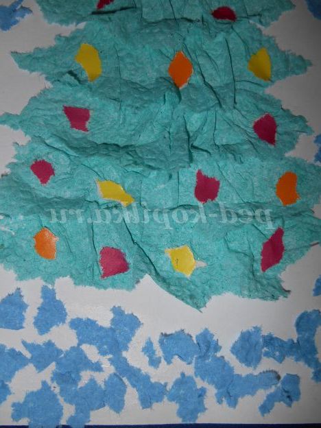 Кольоровий папір різних кольорів рвемо на дрібні шматочки і починаємо прикрашати нашу ялинку.