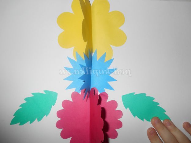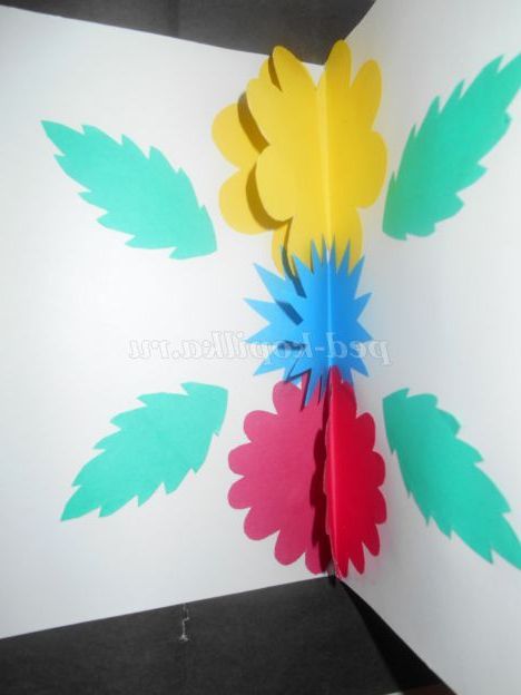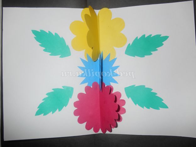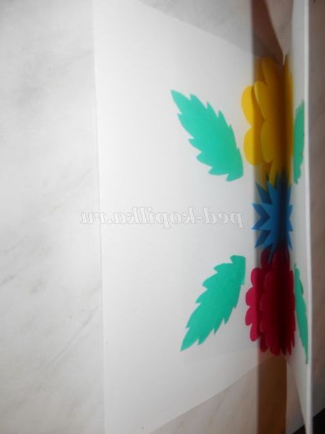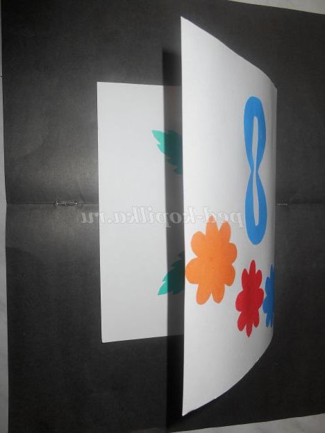 Складаємо аркуш білого картону вдвічі і приклеюємо на внутрішню частину згину об'ємні квіти. Середина квітки повинна знаходиться на середині листівки, згин до згину.