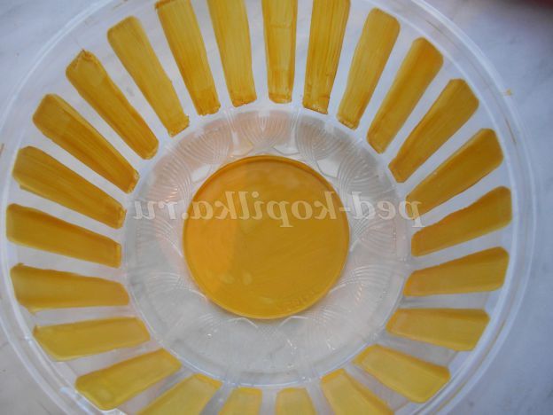 Почнемо нашу роботу з розмальовування внутрішньої частини упаковки від торта. Середину ми розфарбували жовтим кольором.
