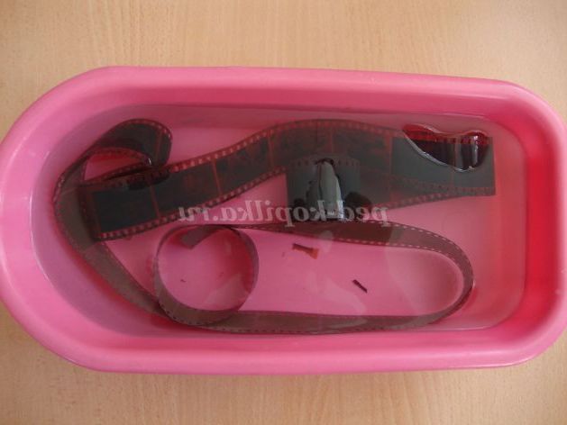 Від плівки відрізати частину, що дорівнює подвоєній довжині картинки. Скласти навпіл глянсовою стороною догори так, щоб отвори перфорації верхньої і нижньої частин збіглися і скріпити затискачами.