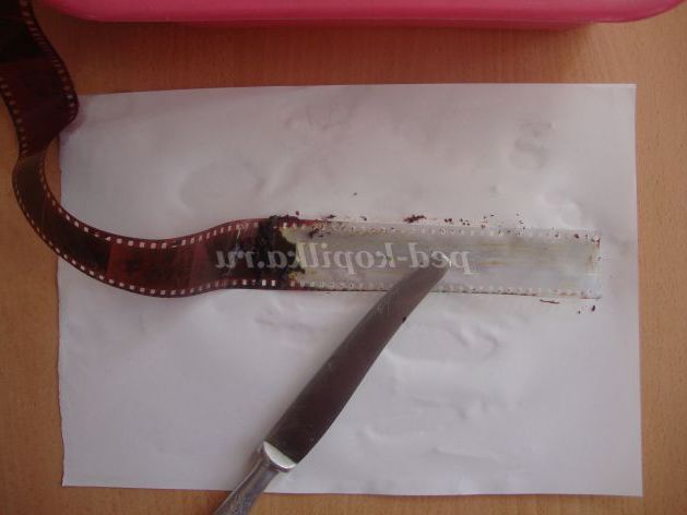 Через 3-5 хвилин взяти столовий ніж, плівку викласти на аркуш паперу (або клейонку) і зчистити з неї негативний шар.