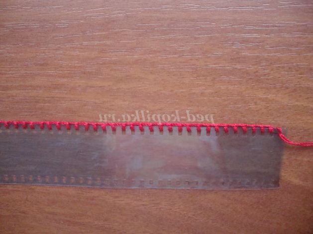 Обшити, продевая голку в отвори перфорації. Почати з кута подвійного кінця. Протягнути голку в крайнє отвір, залишивши вільним кінець довжиною 10-12см.