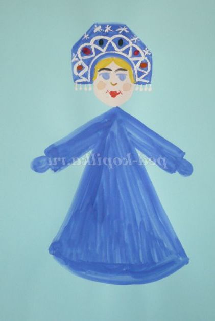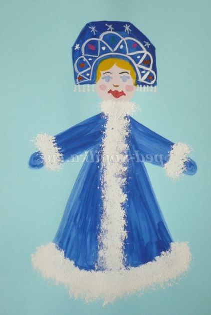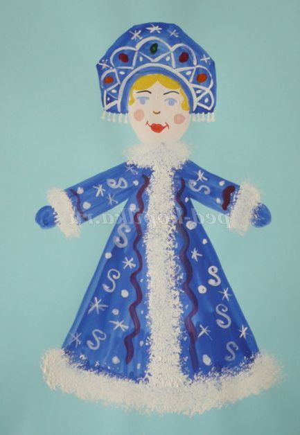 - Також на шубці зображують хутряні пухнасті коміри, узлісся, манжети. Шубка прикрашена візерунками з сніжинок, завитків. Ці візерунки схожі на ті, які малює мороз на вікнах. Снігуронька на всіх картинах струнка, з невеликою голівкою або в шапці, або на ній головний убір кокошник. Кокошник буває різної форми, а ви можете придумати свою форму кокошника.