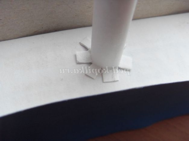 4. Щоб прикріпити трубу до основи, зробимо з одного краю труби кілька маленьких надрізів і розкриємо їх, як показано на фото.
