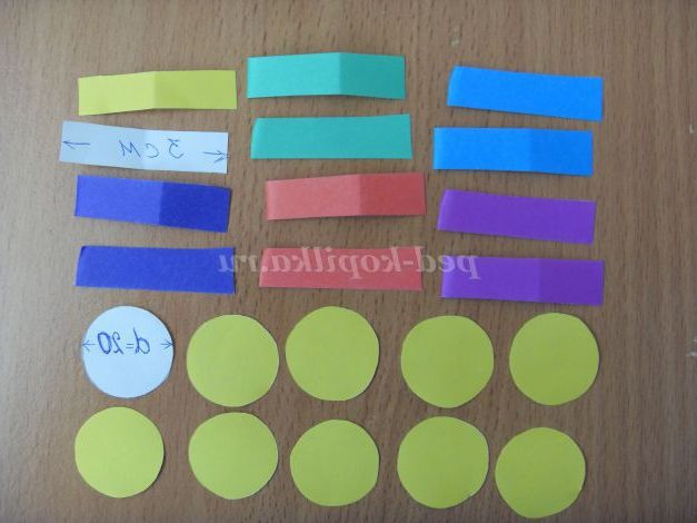 Для ілюмінаторів підбираємо будь-контрастний колір, в нашому випадку підходить жовтий. Знадобиться 10 гуртків діаметрів 2 см і 20-24 смужки кольорового паперу 1х3 см для прапорців.