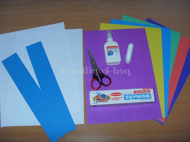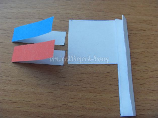 Підготувати смужки 1х6 см червоного і синього кольору. Зігнути смужки навпіл і наклеїти на основу прапора.