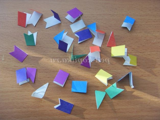 9. Вирізаємо різної форми прапорці, для цього смужки згинаємо навпіл (прапорці будуть двосторонніми) і вирізаємо трикутні, прямокутні, з вирізаним куточком прапорці.