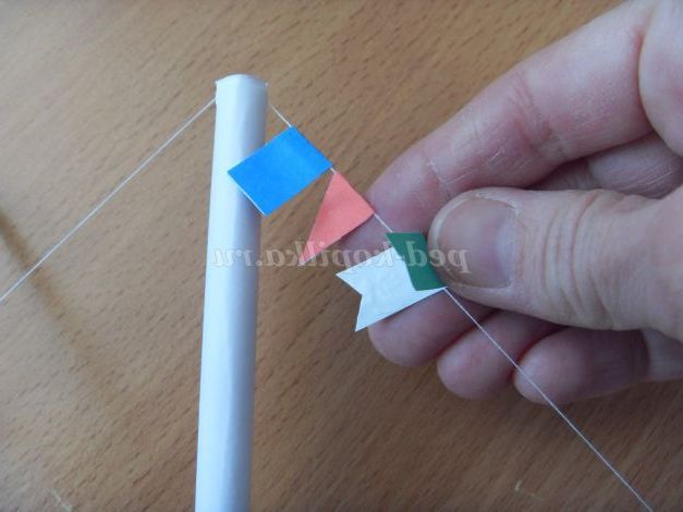 Смужки картону склеюємо між собою по краях, вставивши туди кінці нитки. Нитка повинна бути досить натягнута, щоб прапорці, повішені на неї, не провисали. Кінці картонних смуг фіксувати подовше для кращого скріплення.