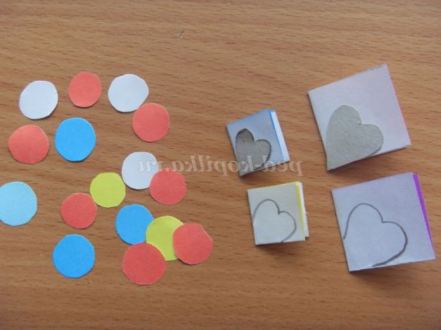 7. Складемо квадрати вчетверо, докладемо шаблон у вигляді сердечка так, щоб гострий куточок перебував у центрі майбутнього квітки, і обведемо його (великий шаблон для великого квадрата, маленький - маленький). Виріжемо і розгорнемо квіточки. Із залишків вирізаємо кружечки для серединки квітки.