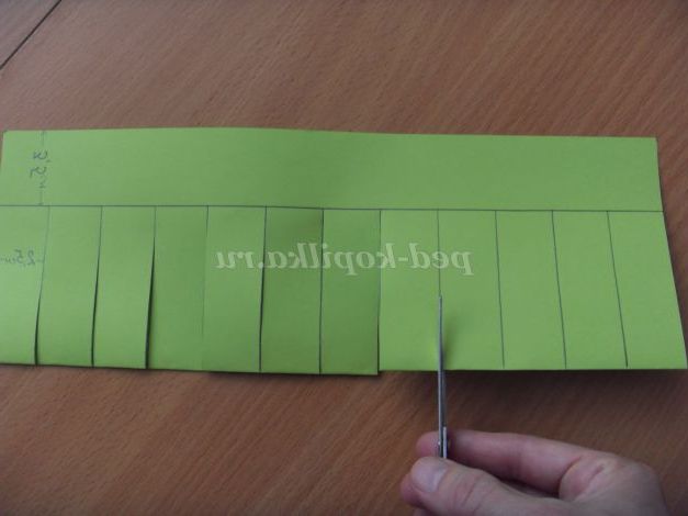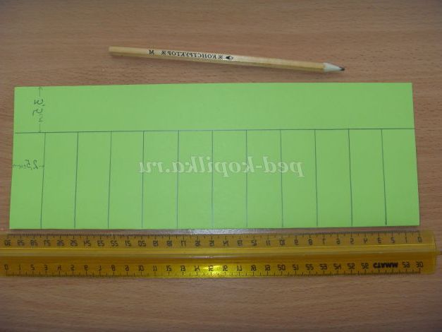 2. З допомогою лінійки наносимо обмежувальну лінію на відстані 3,5 см від довгої сторони, потім розмічають лінії на відстані 2,5 см (при виготовленні новорічного ліхтарика).