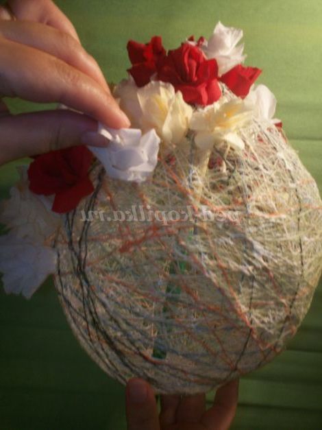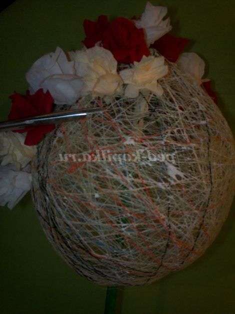 • Коли клей повністю висохне і затвердіє, акуратно сдуваем кульку. Кулька можна відклеїти за допомогою олівця з гумкою на кінці. Кулька можна просто проколоти голкою в декількох місцях і тихенько здути. Дуже акуратно дістаємо кулька зсередини. Якщо нитки зрушили, подвигаем їх на місце.