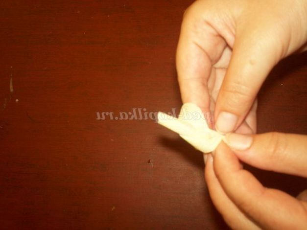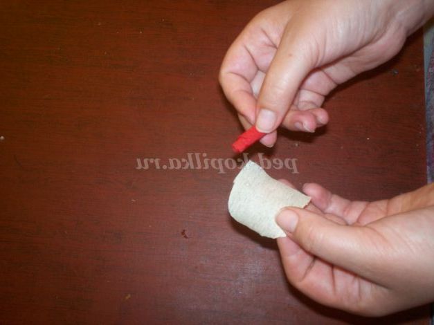 Потім склеюємо наші пелюстки і стовбур для троянди. Для цього змащуємо клеєм наш пелюстка і закручуємо в нього наш стовбур. І так пелюсток 10.