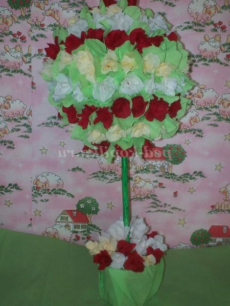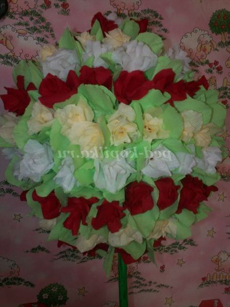 Крона топиария - це величезний простір для фантазії. Використовувати можна абсолютно все: папір (паперові серветки, вирізані квіточки, гофрований папір, папір для квілінгу або складене орігамі), квіти з холодного фарфору або полімерної глини, атласні і капронові стрічки, фетр або бавовна, гудзики і намистини, кава, черепашки, висушене листя та інші природні матеріали, а також багато, багато іншого.