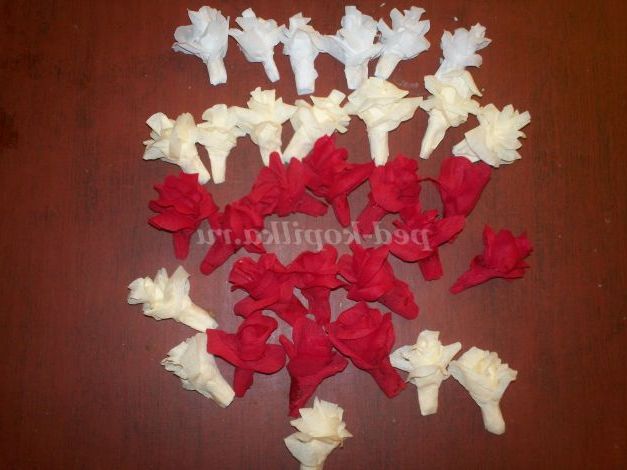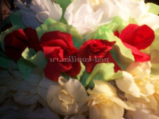 Зробили троянди з червоної, білої та жовтої гофрованого паперу.