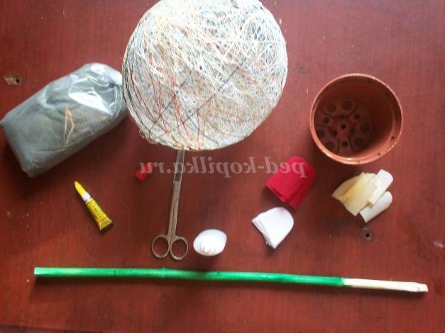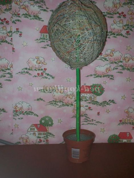 Глину або гіпс розбавляємо водою 1:1 і заливаємо в наш горщик. В ту ж секунду вставляємо в горщик стовбур нашого майбутнього дерева, а в стовбур вставляємо наш кулю і приклеюємо його супер клеєм.