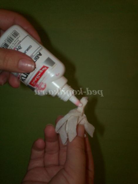 • Тепер нам обов'язково потрібно виконати наскрізний отвір у пляшечці з клеєм. Найкраще вихідний отвір зробити біля самого дна, щоб раціонально використовувати клей і в міру спустошення пляшки не робити нових дірочок (дірочку можна зробити тією ж самою голкою).