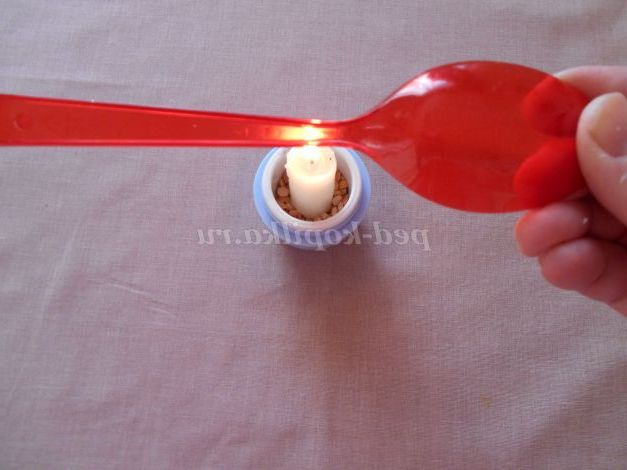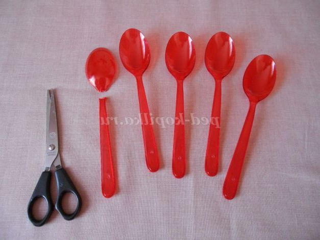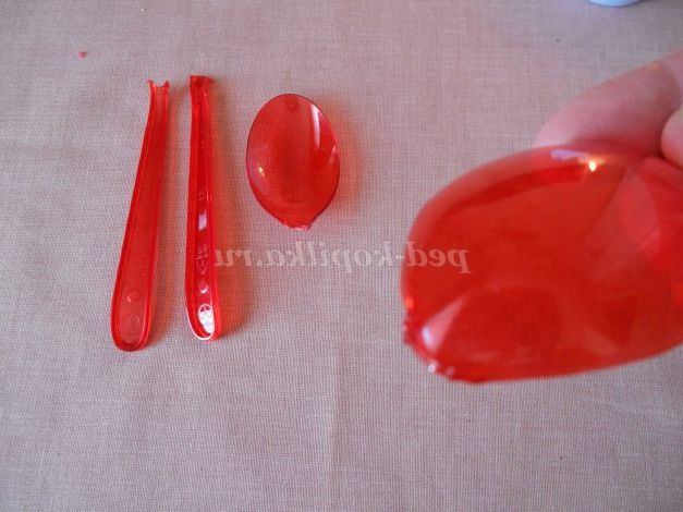 Візьміть 5 червоних ложок, відріжте від них ручки. Хочу дати пораду. Кольорові ложки більш міцні, глянцеві. Вони важко відрізаються. Скористайтеся свічкою. Нагрійте трохи над вогнем ручку і пластик легко отрежется. Край буде гладким. Тільки не тримайте ложку близько до вогню, почорніє. Підготуємо для складання тюльпана всі п'ять ложок.