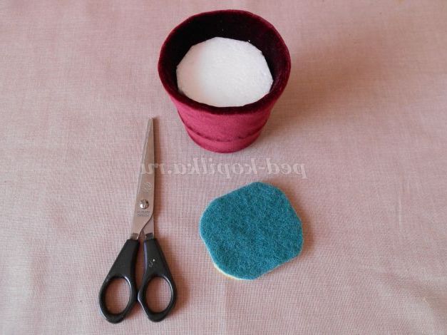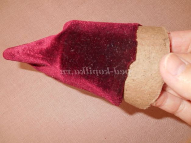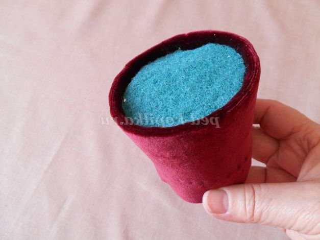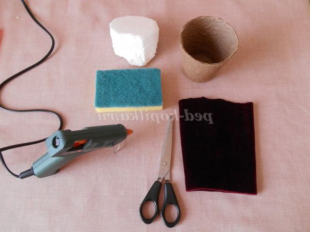 Посадимо наш тюльпан. Я взяла торф'яної горщик, рукав від старого оксамитового плаття, зелену губку і шматочок пінопласту. Ось такий оксамитовий, ошатний горщик вийшов.