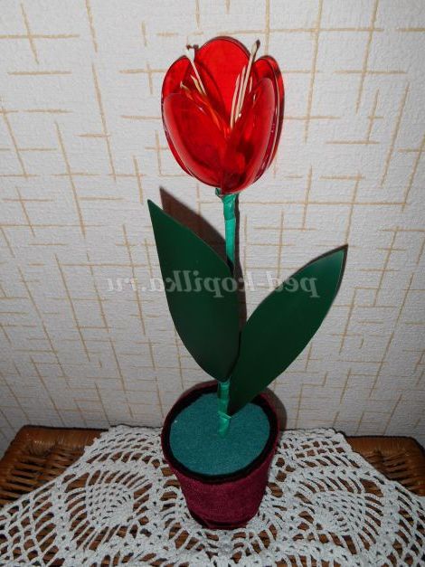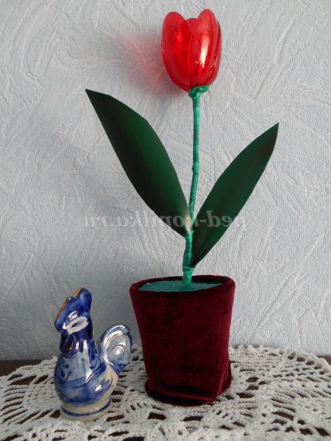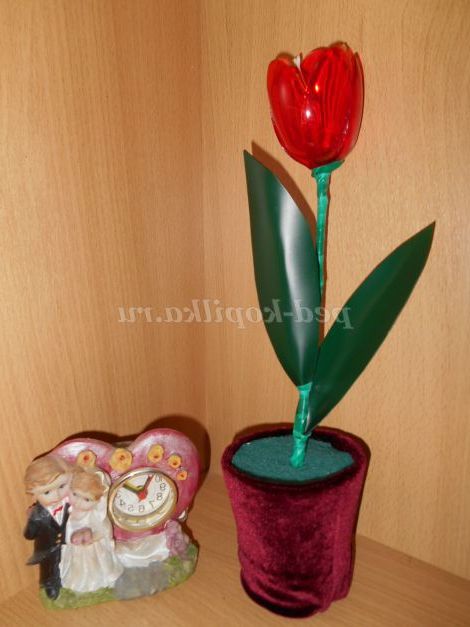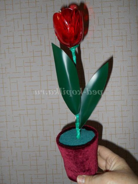 А якщо у вас знайдуться червоні, жовті або іншого кольору ложки, зробіть тюльпан і посадіть його в красивий горщик. Такий тюльпан можна подарувати мамі, бабусі в день 8 березня, ветерана в день Перемоги. Я впевнена, що подарунок припаде їм до душі.