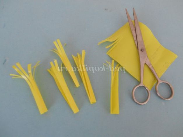 Жовтий пластиковий прямокутник розріжте на вузькі смужки, закрутіть трубочкою.