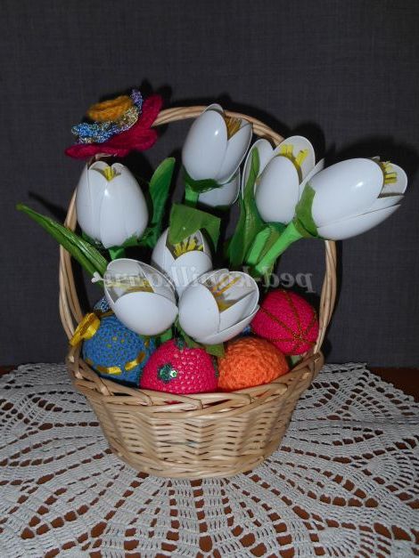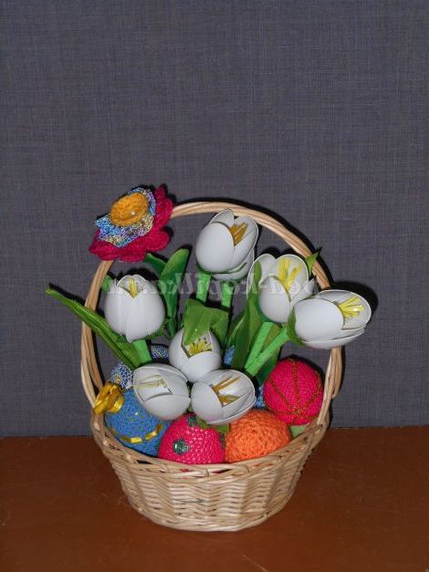 Можна оформити композицію до світлого свята Великодня. Покладіть в кошик крашанки або, як у нашому випадку - в'язані.